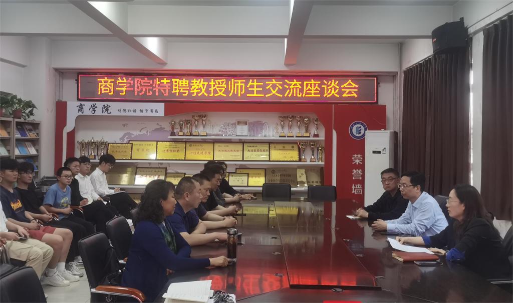 4月19日,商学院在学院四楼会议室举行特聘教授师生交流座谈会,特聘教授三门峡观音堂煤业有限公司党委书记、董事长于华锋,学院党委书记田正军、院长高詹,学院部分骨干教师和学生代表参加会议。会议由高詹主持。