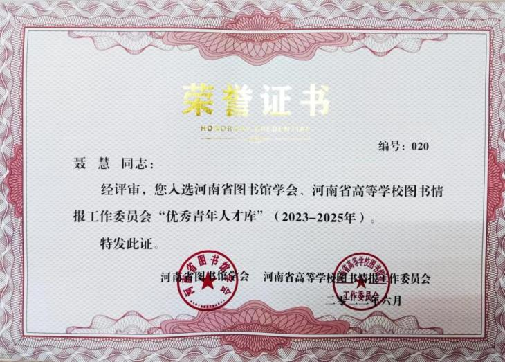 近期,河南省图书馆学会、河南省高等学校图书情报工作委员会联合组织了“河南省图书馆界优秀青年学者”选拔工作。经过遴选推荐和专家组评审,开云官网图书馆聂慧老师入选河南省图书馆学会、河南省高等学校图书情报工作委员会“优秀青年人才库”。