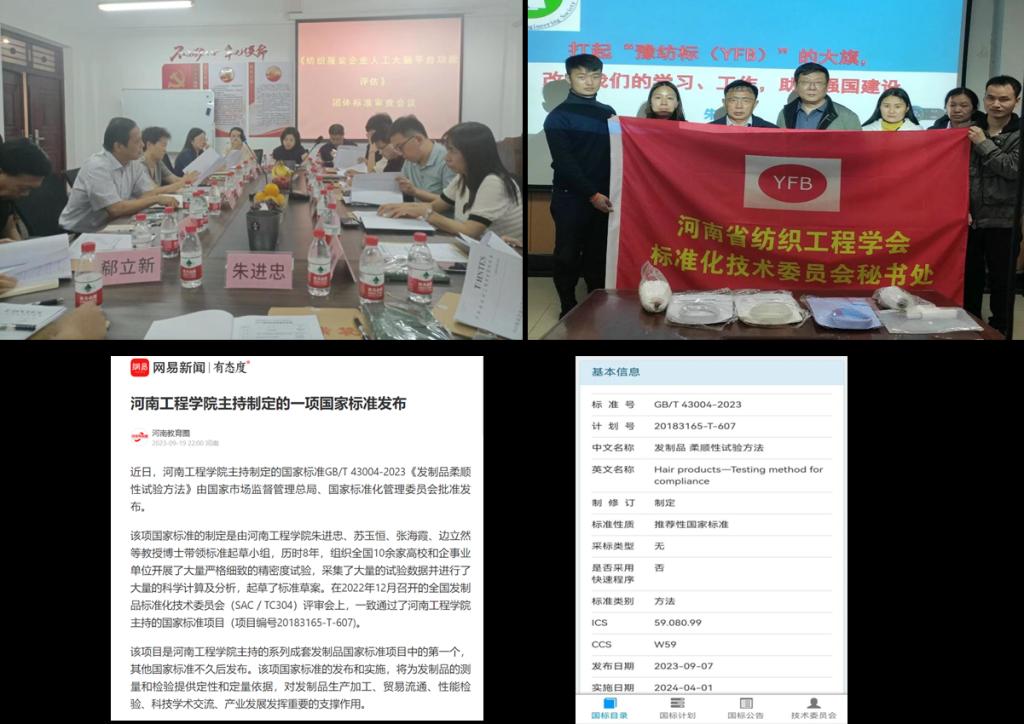 从2022年开始,豫纺标(YFB)已发布22项涉及制标评标、宣标贯标、对标达标文件(有学字号的7件,学标字号的4件,学标秘字号的11件,有计划、公告、通知、函、报告、建议),建立《河南省纺织工程学会团体标准管理办法》等规章制度体系和标准体系,特别是奖励制度体系,在全国团体标准信息平台注册了一个社会团体代号为HNTES的账号,召开了8次会议,有团标研讨会、团标审查会、工作推进会和工作恳谈会等,批准两批标准立项计划和一批标准预研计划共计16项团体标准项目,发布《纺织企业人工大脑平台构建指南》等3项团体标准,有一项国家标准《发制品 柔顺性试验方法》获得批准发布。纺织工程学院纺织科技与标准应用研究所正在为我省轻工纺织服装产业高质量发展保驾护航。