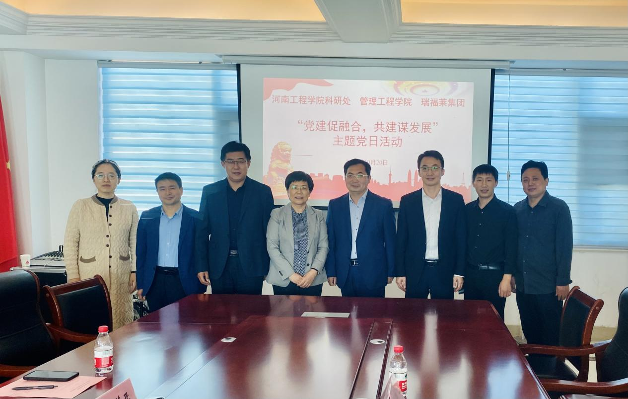 为深入学习贯彻习近平新时代中国特色社会主义思想,激发党建活力,深化校企合作,实现党建共建与校企合作的深度融合,提升应用创新型人才培养质量。10月20日上午,开云kaiyun官方网站科研处、管理工程学院与瑞福莱集团公司联合开展“党建促融合,共建谋发展”主题党日活动。学校科研处处长刘帅霞、管理工程学院党委书记张立军、院长黄德金、瑞福莱集团公司董事长刘克强、总经理刘永华及双方相关负责人参加活动,活动由张立军同志主持。