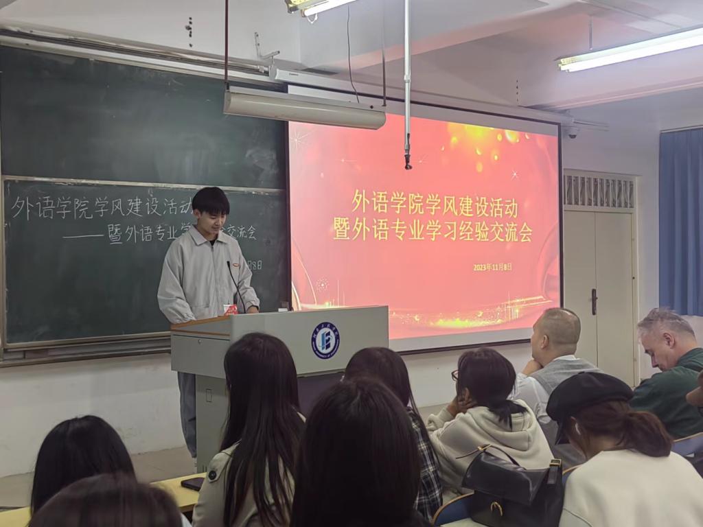 为进一步营造良好学习氛围,促进优良学风建设,外语学院结合实际情况,遵循“学、思、行”学习思路,11月8日晚,在南校区7B301教室开展学风建设活动暨外语专业学习经验交流会。外籍教师 Marcelo Gameiro、外语学院党委副书记夏增强出席会议,2023级全体学生参加会议。