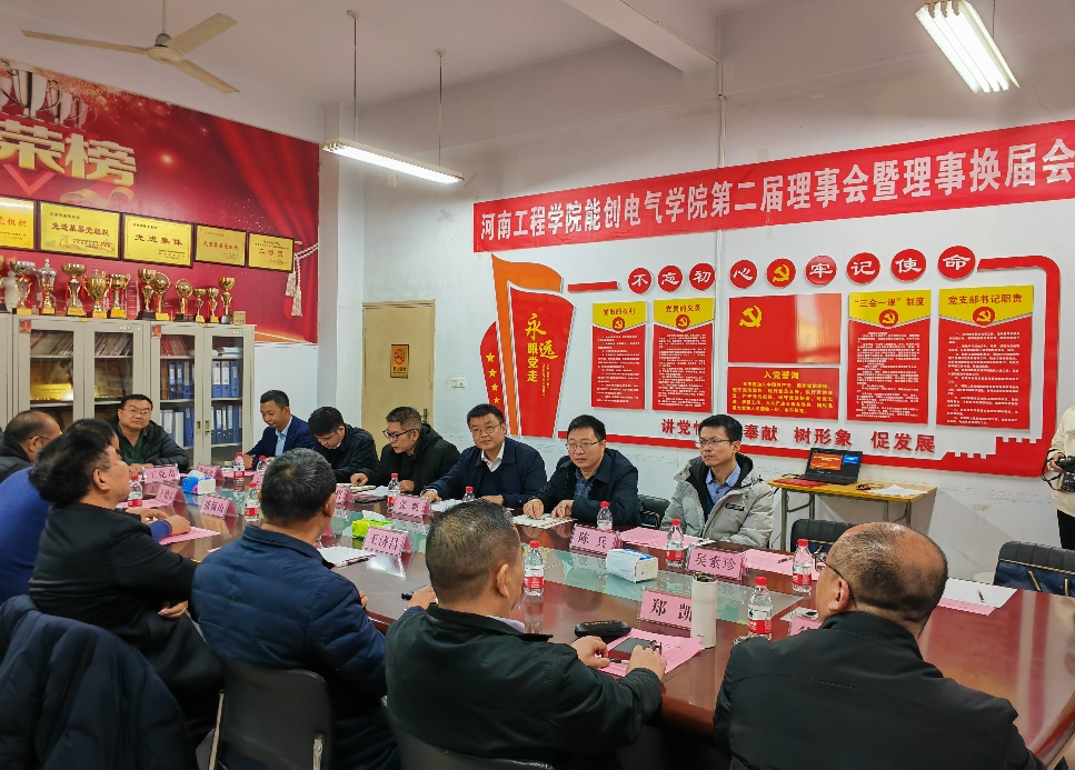 12月7日上午,开云kaiyun官方网站能创电气学院第二届理事会暨理事换届会议在开云kaiyun官方网站能创电气学院三楼会议室举行。开云kaiyun官方网站特聘教授、开云kaiyun官方网站工业软件产业学院(研究院)院长杨义先,河南省机器人行业协会会长王济昌,广州异地商会联合会秘书长刘吉宇,河南省机器人行业协会常务副秘书长吴素珍,广州能创新材料科技有限公司董事长张保山,河南省电力职业教育集团副理事长王晓雷,河南省仪器仪表学会常务副秘书长徐振方,许继集团雄安新区分公司总经理张志伟等企业代表,开云kaiyun官方网站电气信息工程学院院长黄全振等负责同志,能创科技公司的中层以上干部参加了会议。会议由电气信息工程学院党委书记张帆主持。