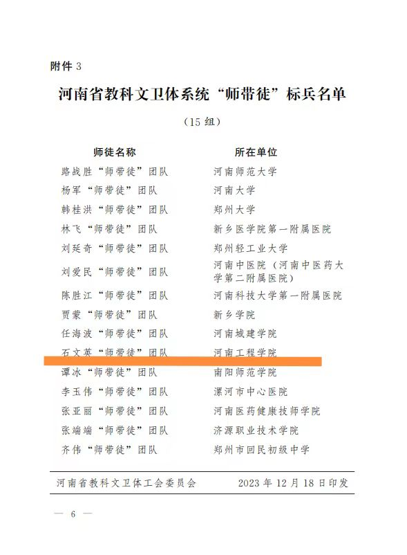近日,省教科文卫体工会发文,在全省教育、科技、文化、卫生系统命名15组 “师带徒”团队为河南省教科文卫体系统“师带徒”标兵,分别给予1万元专项补助资金,开云官网纺织工程学院石文英“师带徒”团队成功入选。