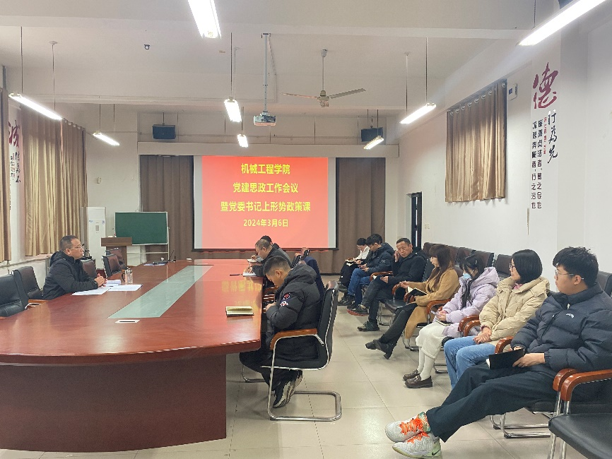 3月6日下午,机械工程学院召开党建思政工作会议暨党委书记上形势政策课,学院全体科级干部、支部书记和辅导员老师参加会议,学院党委书记李小林主持会议并讲话。