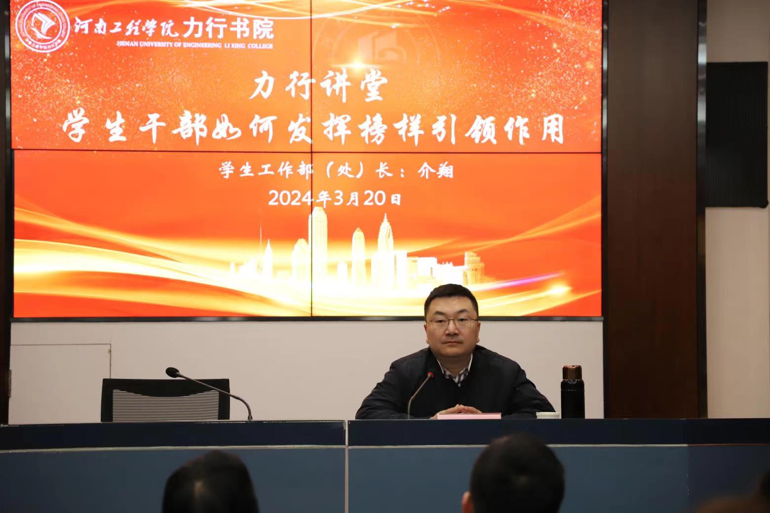 为落实立德树人根本任务,切实加强书院学生干部队伍建设,推动班风学风建设内涵式发展,3月20日,力行书院在办公楼报告厅举办“力行讲堂”系列讲座——学生干部如何发挥榜样引领作用。报告邀请学校学生工作部(处)长介翔主讲,书院全体学工队伍和部分学生干部参加,会议由学院党委书记李鑫主持。