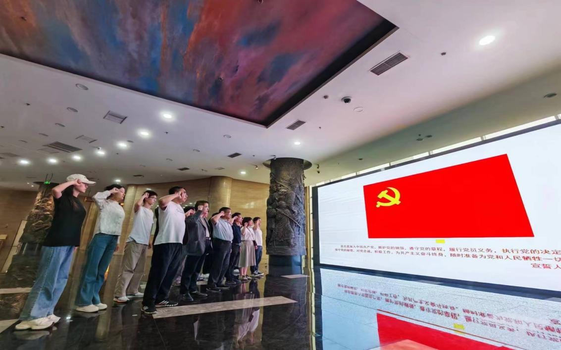在中原英烈纪念馆展厅中央,支部委员陈庆丰带领全体党员整齐列队、右手握拳,面对鲜艳的党旗重温入党誓词。全体党员相继参观了五四运动、二七大罢工的开展厅、星火燎原土地革命战斗厅、抗日战争厅、解放战争厅等,面对一张张英烈事迹图片、一份份书信文稿、一件件珍品驻足凝望,缅怀革命英烈的战斗历程,汲取前进动力。