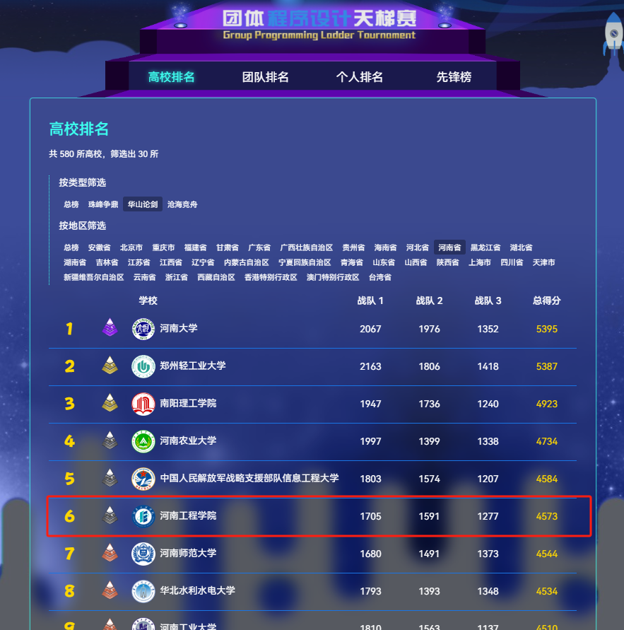 在近日公布的第九届“中国高校计算机大赛-团体程序设计天梯赛”成绩中,来自软件学院的南苑一队、南苑二队和计算机学院的河工一队组成的开云kaiyun官方网站代表队,在激烈的比赛中以总分4573的优异成绩,荣获河南省高校第6名、全国第80名的佳绩,刷新了学校在该项赛事中的最好成绩。