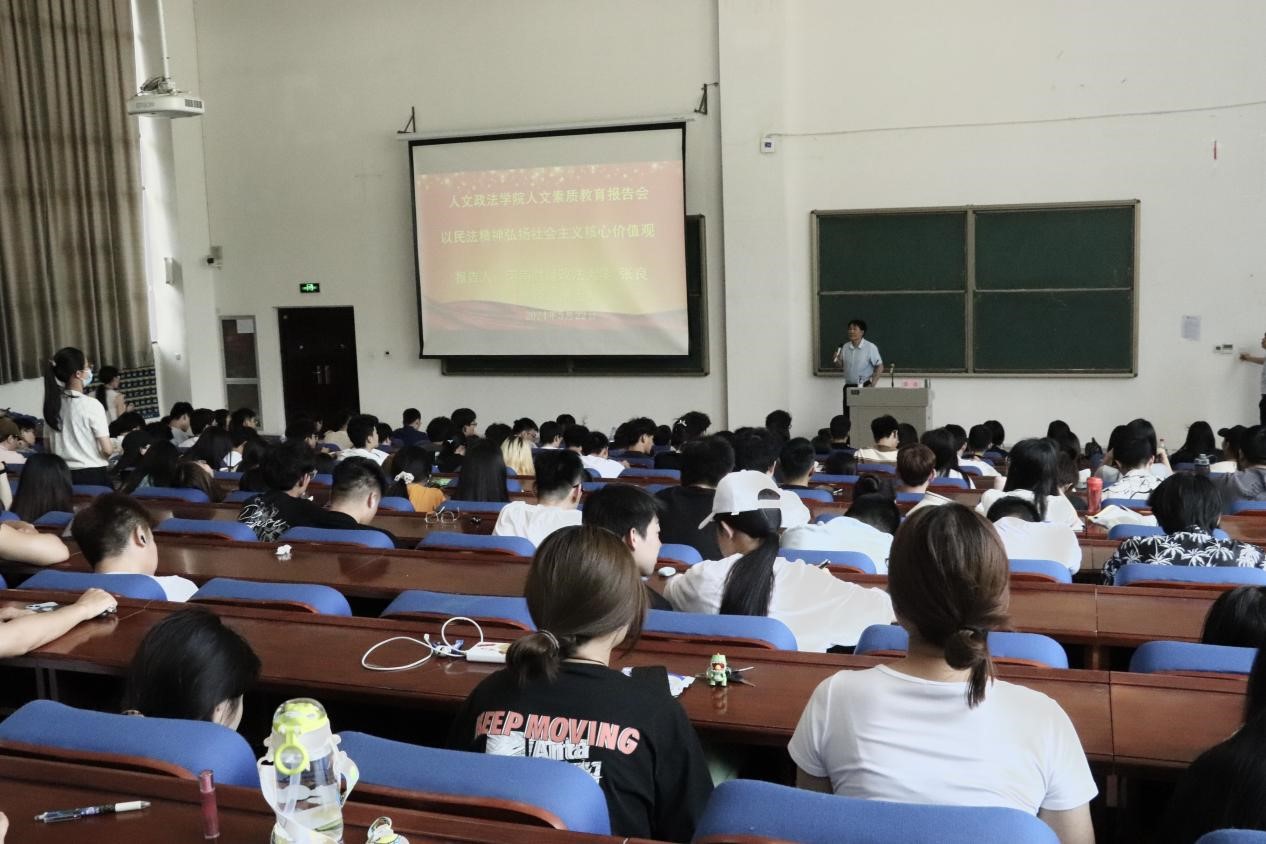 为丰富大学生的校园文化生活,提高大学生的思想修养水平,5月22日下午,人文政法学院在九号楼国学大讲堂举行了第一期人文素质教育讲坛,新时代河南省普法宣传员、河南财经政法大学民商经济法学院副院长张良教授以“以民法精神弘扬社会主义核心价值观”为题为师生作普法宣传专题报告,人文政法学院知识产权专业全体学生及服装学院、经济贸易学院的学生代表参加了报告会。报告会由人文政法学院院长徐金超教授主持。