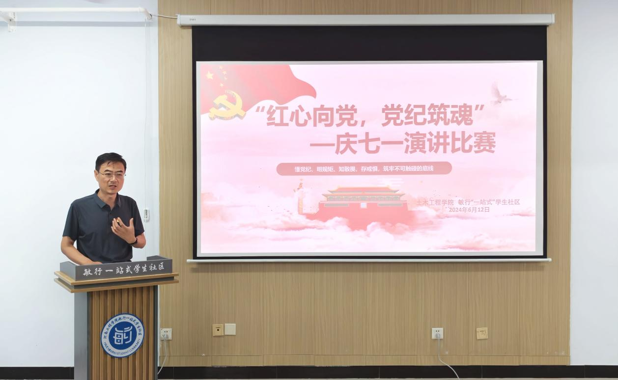 6月12日下午,土木工程学院联合敏行“一站式”学生社区在慧苑4号楼多功能活动室举办了“红心向党·党纪筑魂”庆七一主题演讲比赛。土木工程学院党委书记卢朝东、慧苑3号楼4号楼功能型党支部书记赵坤、敏行“一站式”学生社区育人导师冯妍、梁家佳良老师和学生党员代表参加。