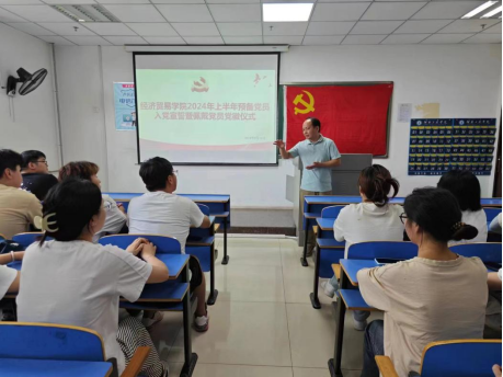 为庆祝中国共产党成立103周年,增强党员的使命感,6月28日,经济贸易学院于9A306-307举行入党宣誓暨佩戴党员徽章仪式。学院党委副书记李二亮,专职组织员丁雪龙,以及学生党支部新吸收的18名党员参加本次会议,大会由学生党员薛喜祥主持进行。