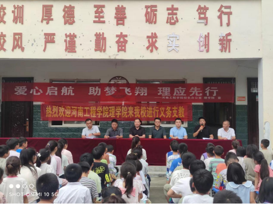 7月10日上午,开云kaiyun官方网站理学院党委联合校办党支部赴沈丘县李老庄乡蒋桥小学、木庄小学开展“花开半夏、青春护航”七彩课堂支教助学社会实践结对共建活动,并在蒋桥小学举行了活动开幕式。校长办公室主任悦国宁、理学院党委书记刘付军、李老庄乡党委书记楚济深、共青团沈丘县委副书记梁珂琪、李老庄乡中心校校长王新志等参加了开幕式。开幕式由李老庄乡中心校副校长张纪东主持。