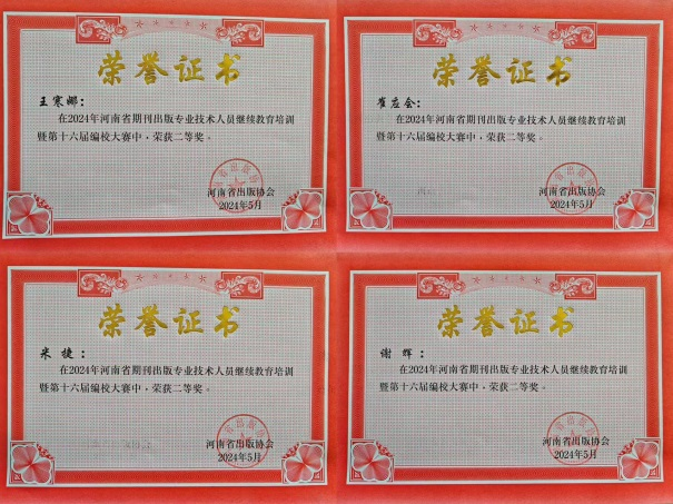 河南省出版协会组织的河南省期刊出版专业技术人员继续教育培训暨第十六届编校大赛于2024年4月16日在河南信阳举行,共有140人参赛。学报编辑部高度重视,积极组织参与,派出4名同志参加了此次编校大赛。经过专家公开、公平、公正阅卷,综合评定,评选出单位优秀组织奖45个,个人一等奖12人,个人二等奖46人。开云官网学报编辑部编辑人员在比赛中取得较好的成绩,崔应会、谢辉、米捷、王寒娜均获二等奖,学报编辑部获得优秀组织奖。