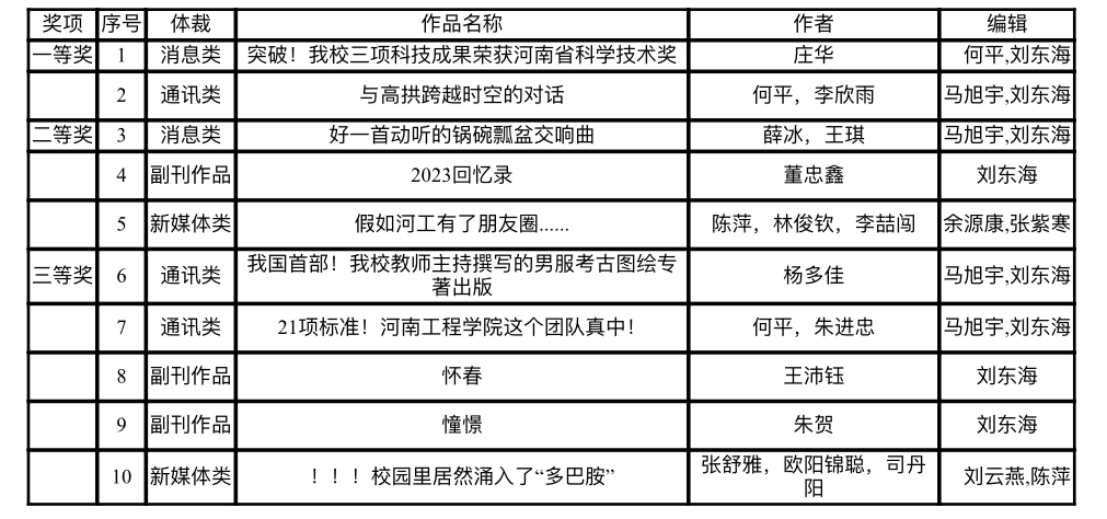 近日,河南省高校校报研究会、河南省新闻工作者协会高校报委员会公布2023年度河南省高校好新闻奖评选结果。开云官网校报共有10件作品获奖,其中一等奖2项、二等奖3项、三等奖5项。题材涵盖消息、通讯、评论、副刊、新媒体作品等多个类别。