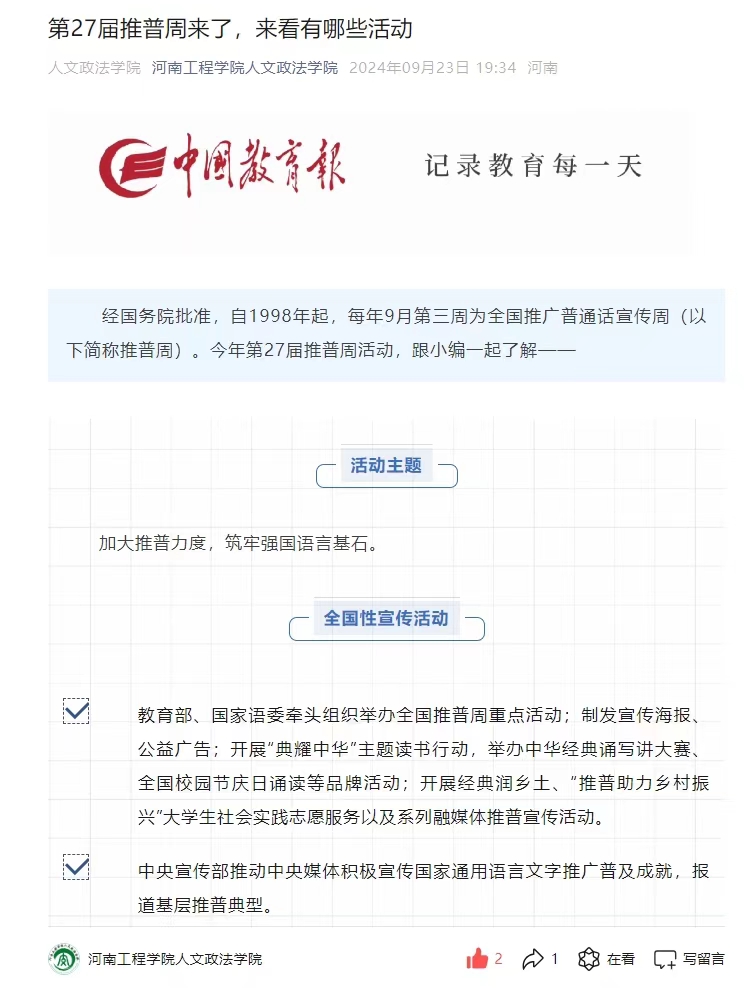 利用学院官方网站、官方微信公众号、板报等多种形式,积极开展普通话使用宣传活动,营造良好的推普氛围。