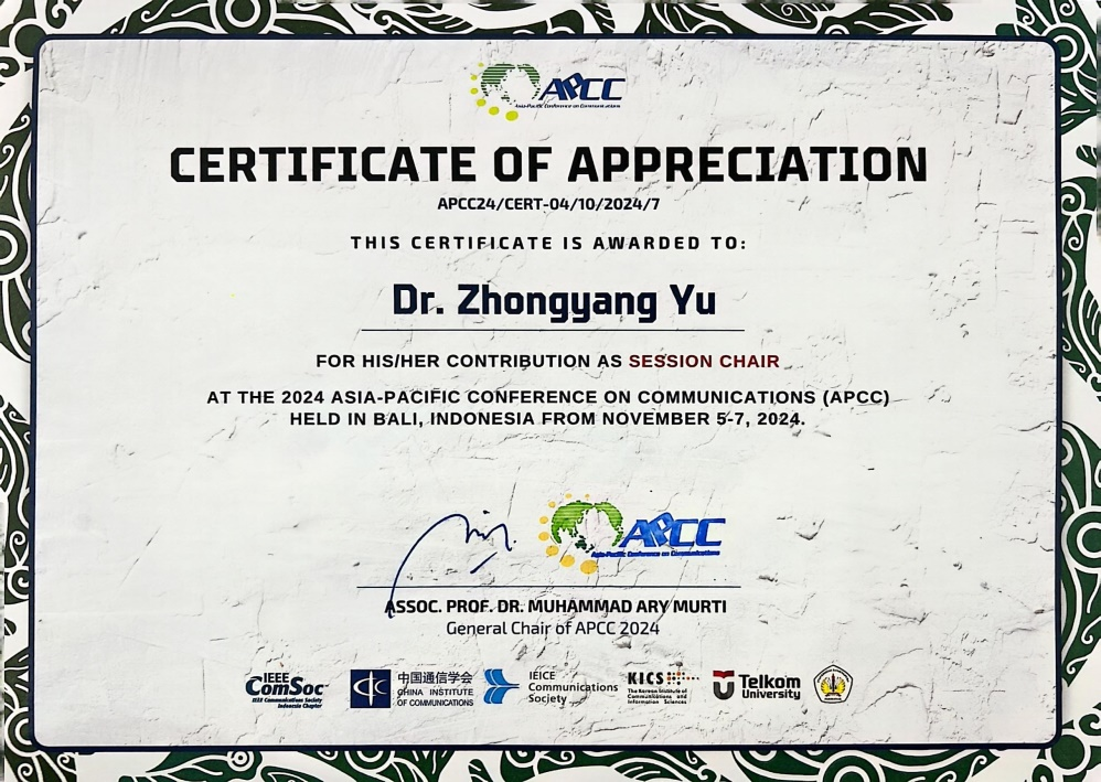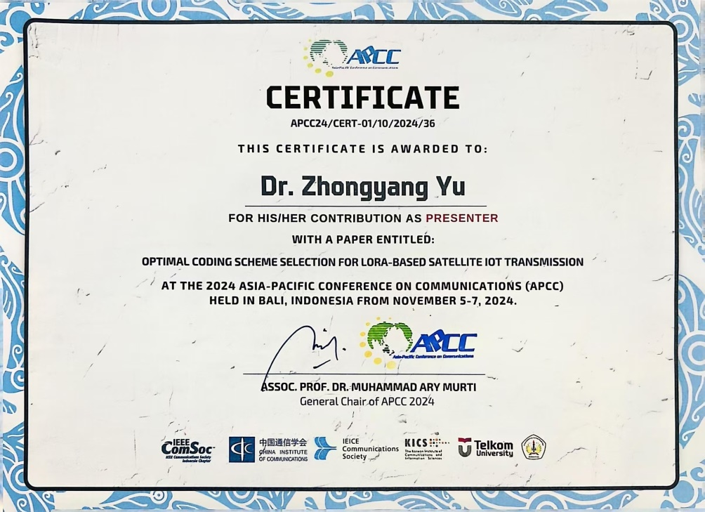 开云官网计算机学院青年教师余忠洋博士参加了本届会议,并作为报告会主席(Session Chair)主持了1场平行报告会,同时宣读了题为“Optimal Coding Scheme Selection for LoRa-Based Satellite IoT Transmission”(基于LoRa的卫星物联网传输的最佳编码方案选择)学术论文,向国际同仁介绍他的相关研究工作和成果,并同与会专家、学者开展广泛交流。会议期间,还向参会代表介绍了学校概况,进一步扩大了学校影响力,促进相互交流与发展。
