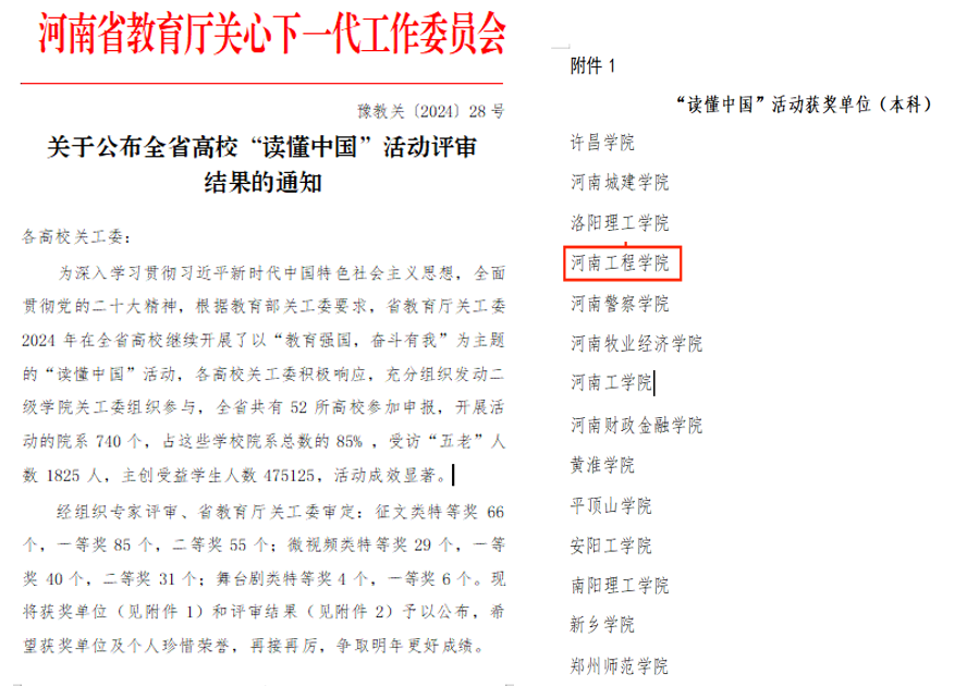近日,省教育厅关工委公布了2024年“读懂中国”活动评审结果。开云官网选送的9个作品均进入获奖名单,其中征文组特等奖一个,二等奖四个,舞台剧组一等奖一个,微视频组二等奖三个。开云官网荣获教育厅关工委2024年“读懂中国活动获奖单位”。