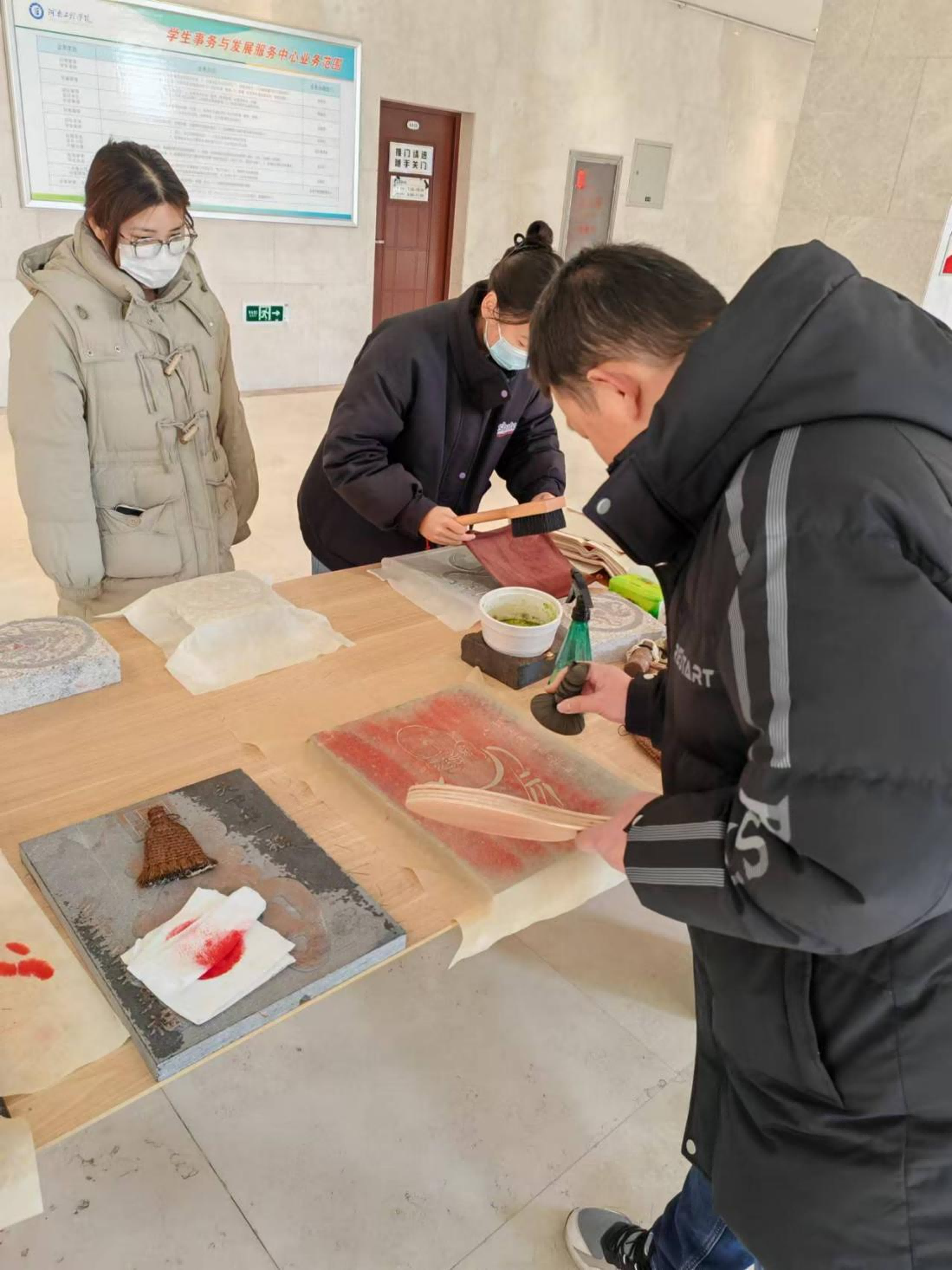 1月10日,由校工会、校公共艺术教育中心、河南省文化传播与艺术创新实践基地联合主办的“祥龙回首辞旧岁,金蛇起舞迎新年”年画拓印体验及送春联送祝福活动在综合楼一楼大厅举行。