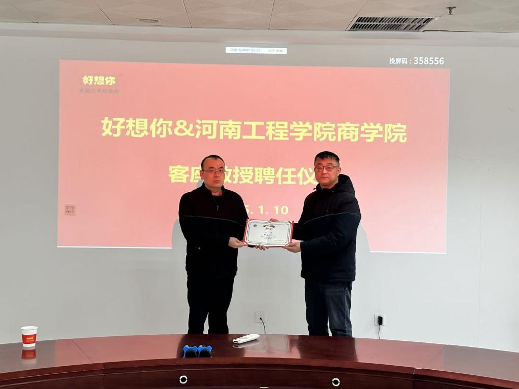 1月10日,商学院与知名企业好想你健康食品股份有限公司在好想你会议室举办人才共创交流会,以及举行校外实习实践基地授牌活动和客座教授受聘仪式。商学院党委书记田正军及相关专业系主任赴好想你总部大楼参加此次活动。