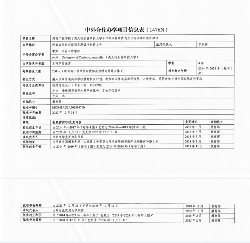 教育部国际合作与交流司发布《关于部分高校中外合作办学及内地(大陆)与港澳台合作办学机构和项目申请延期的批复》(教外司办学〔2025〕52号),开云官网与澳大利亚堪培拉大学合作举办视觉传达设计专业本科教育项目招生期限延长至2028年。自2014年,该项目已连续三次获教育部批准延长办学。
