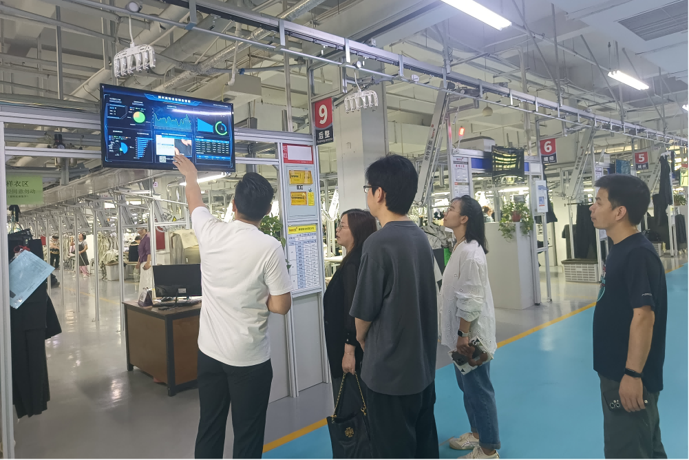 在郑州奥特制衣有限公司高层领导的陪同下,刘杰一行首先参观了企业的智能化生产车间。企业生产部经理付军超详细介绍了自动裁床、智能吊挂生产线和数字化仓储的运行情况。刘杰对企业智能化生产的成果表示高度赞赏。她指出,服装行业正经历从传统制造向智能制造的转型,学院的中试基地正是为了培养高水平应用型人才而设立。她希望未来能与企业在技术研发、人才培养等方面展开深度合作。