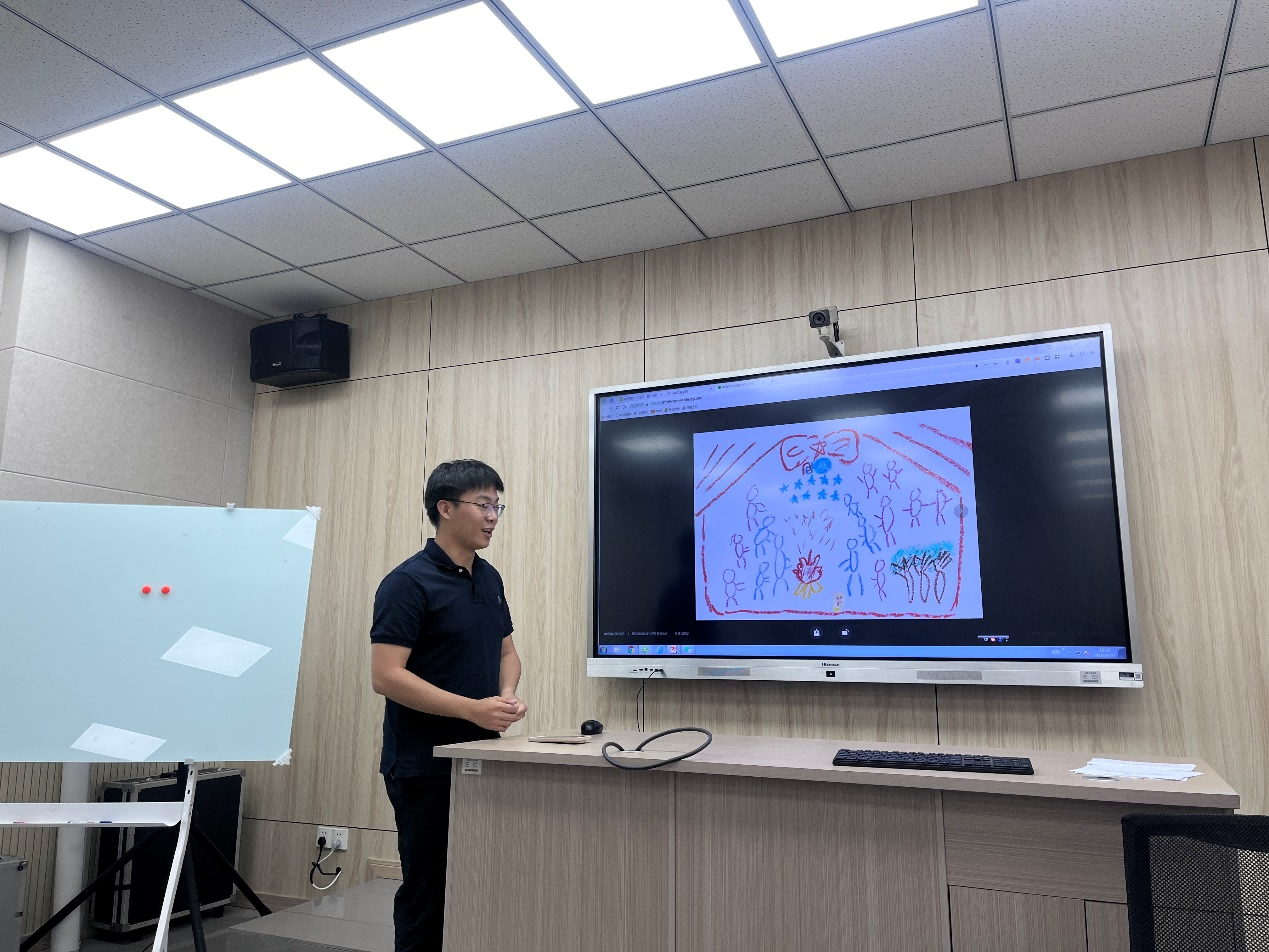 本次主题党日活动借助团体心理咨询技巧,通过绘画形式进行实践体验,引导青年党员坚定理想信念,在奋斗中绽放青春光彩。活动中,同学们被随机分为5个小组,依次接龙,共同完成一幅绘画作品,深入讨论该作品的意义,并为作品起上符合主题的名称。张淑靖对活动过程、讨论方法等做了基本要求,最终在小组的合作下形成了《散是满天星,聚是一团火》《希望》《生在红旗下,长在春风里》《奋斗新时代》《青声踏浪行,薪火跬步至》5幅主题鲜明的绘画作品,作品虽然内容不同,却不约而同地表达了共同的意义。随后各小组分享了作品的意义、活动中的收获、对祖国美好未来的祝福以及作为青年应有的担当和责任。最后,张淑靖对本次活动进行总结,并对大家提出3点希望,一是希望大家能够在将来的工作和生活中学会欣赏别人,提升团队合作能力;二是希望党员同志们能够牢记自己使命,不负韶华、砥砺前行;三是养成终身学习的习惯,为祖国的发展贡献自己的力量。